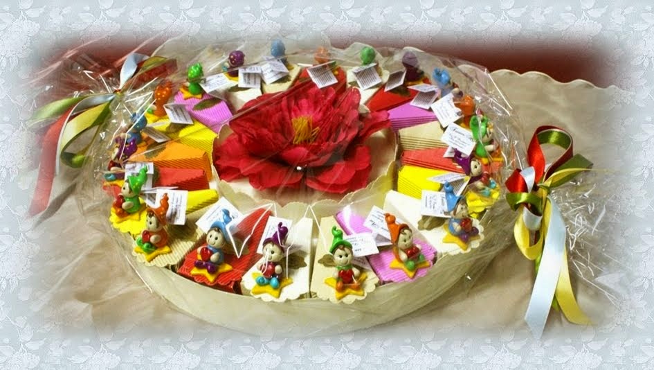 cake consists of 20 slices decorated with 20 elves handmade polymer clay.